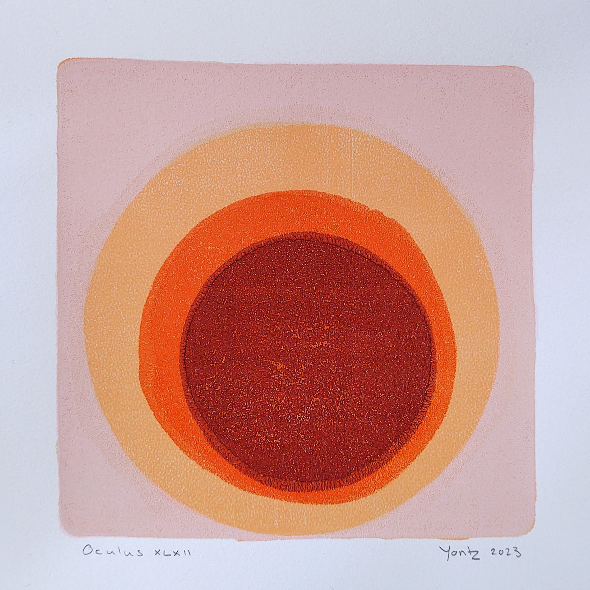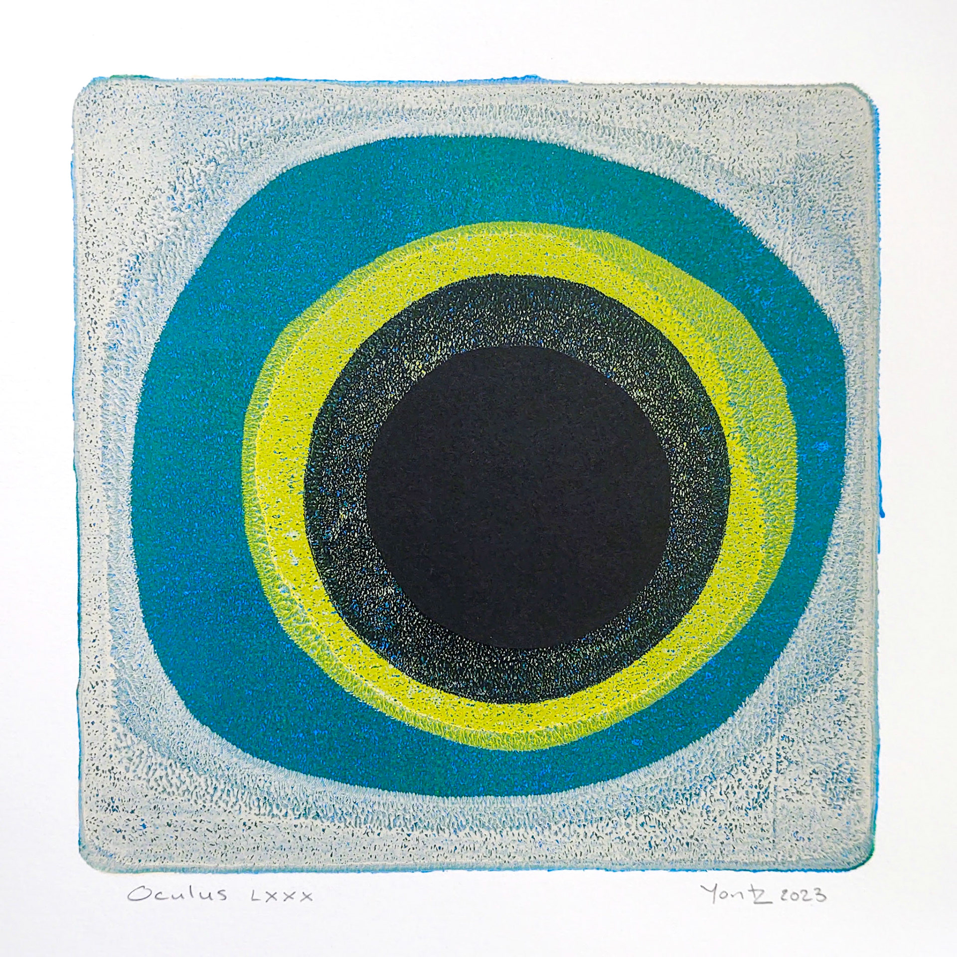 Oculus is Latin for eye. I chose this name because an early print resembled an eye and most prints in this series have an eye shape. Later prints are more like portals to a different world or universe or maybe just to the existing world outside.